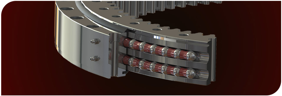 Tel yataklı döner tabla yatakları, sertleştirilmiş çelik tel yollarının hafif alüminyum veya paslanmaz gövdeye entegre edilmesiyle geliştirilen özel bir tasarımdır. Bu yapı sayesinde, klasik masuralı ve bilyalı yataklara kıyasla %60’a varan ağırlık tasarrufu sağlanırken, ±0,01° konum hassasiyeti elde edilir. Ø300 mm – Ø5000 mm çap aralığında içten dişli, dıştan dişli veya dişsiz opsiyonlarla üretim yapılabilmektedir.