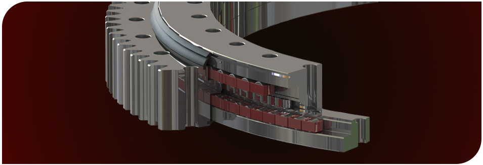 Üç sıra masuralı döner tabla yatakları, silindirik makara dizilimi sayesinde en yüksek eksenel, radyal ve devrilme momenti kapasitesini sunar. Üst ve alt sıralar eksenel yükleri, orta sıra ise radyal yükleri taşıyarak yük dağılımını optimize eder ve temas gerilimini minimum seviyeye indirir. Ø800 mm – Ø5000 mm aralığında, içten dişli, dıştan dişli veya dişsiz seçeneklerle üretilebilmektedir.
